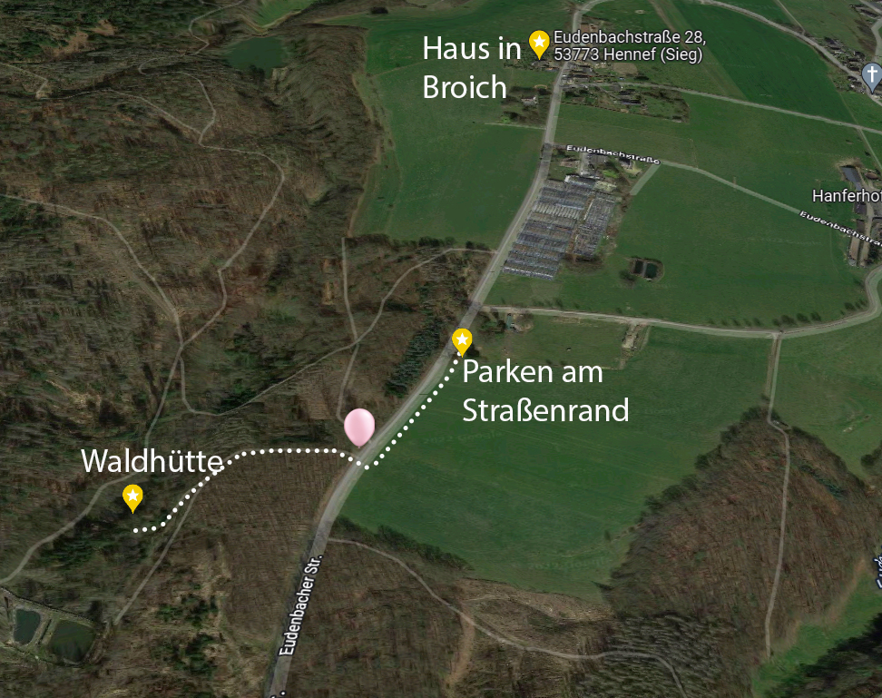 Parkt bitte am Straßenrand auf der Eudenbacherstraße – kommt dann anschließend den Weg zu Fuß in den Wald hinunter.